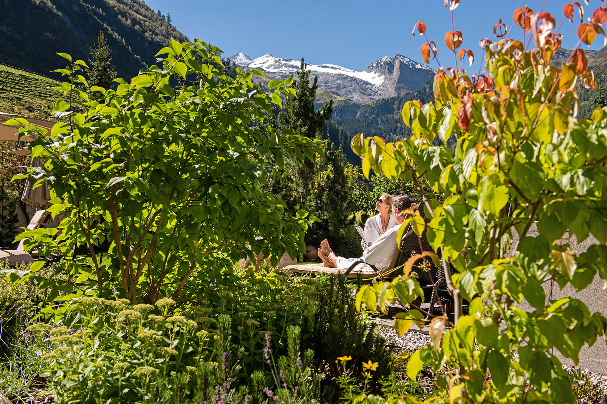 Der Panorama-Außen-Whirlpool wirkt entspannend und belebt zugleich. Die Aussicht auf die zahlreichen Dreitausender ist immer ein Erlebnis – egal ob beim letzten Sonnenstrahl im Sommer oder im glitzernden Winterweiß. Im Alpengarten verbindet sich Naturgenuss mit Erholung, und jeder Moment wird zum bewussten Durchatmen.