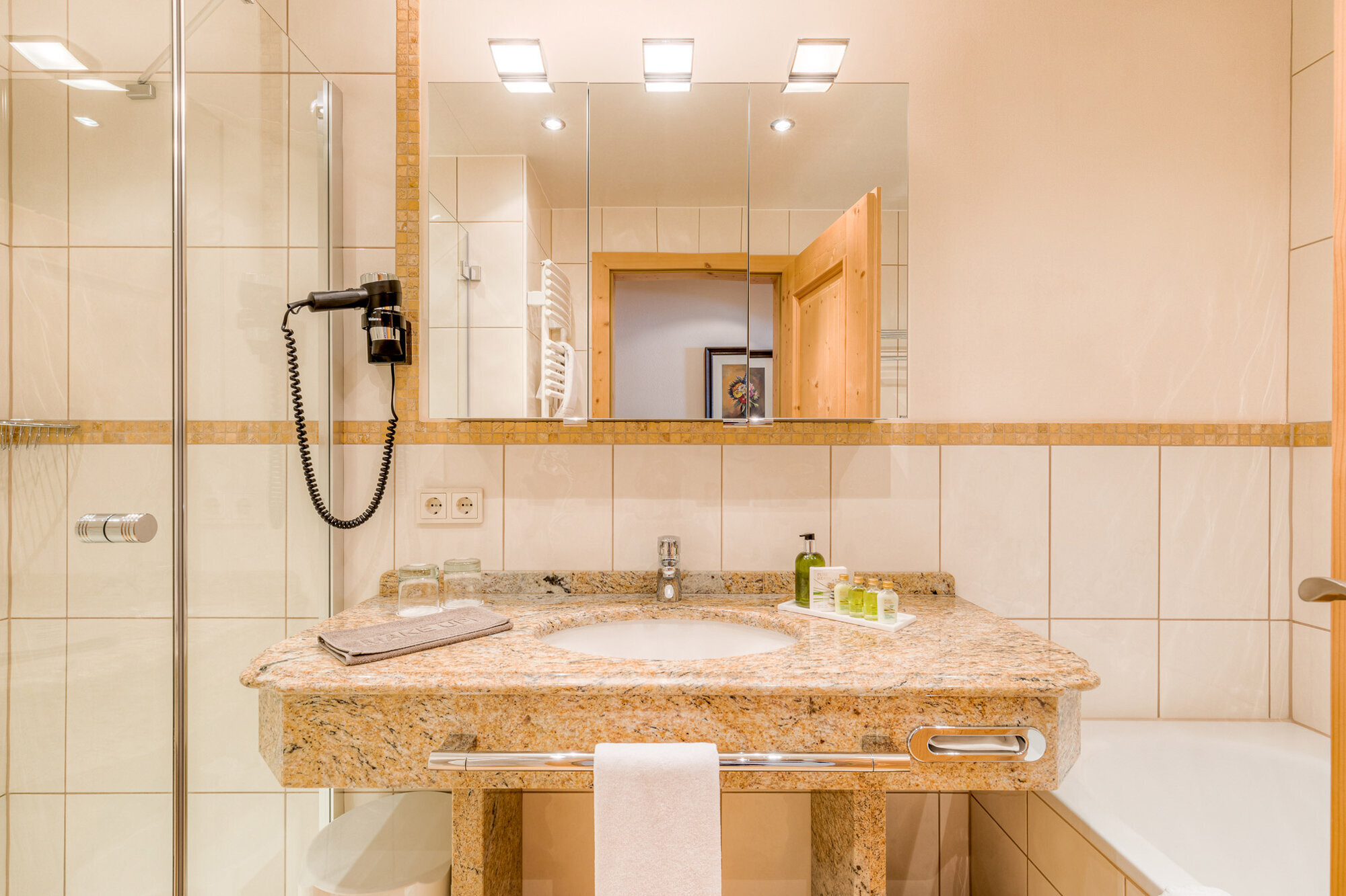 • Geräumiges Badezimmer mit Dusche und Badewanne – WC getrennt